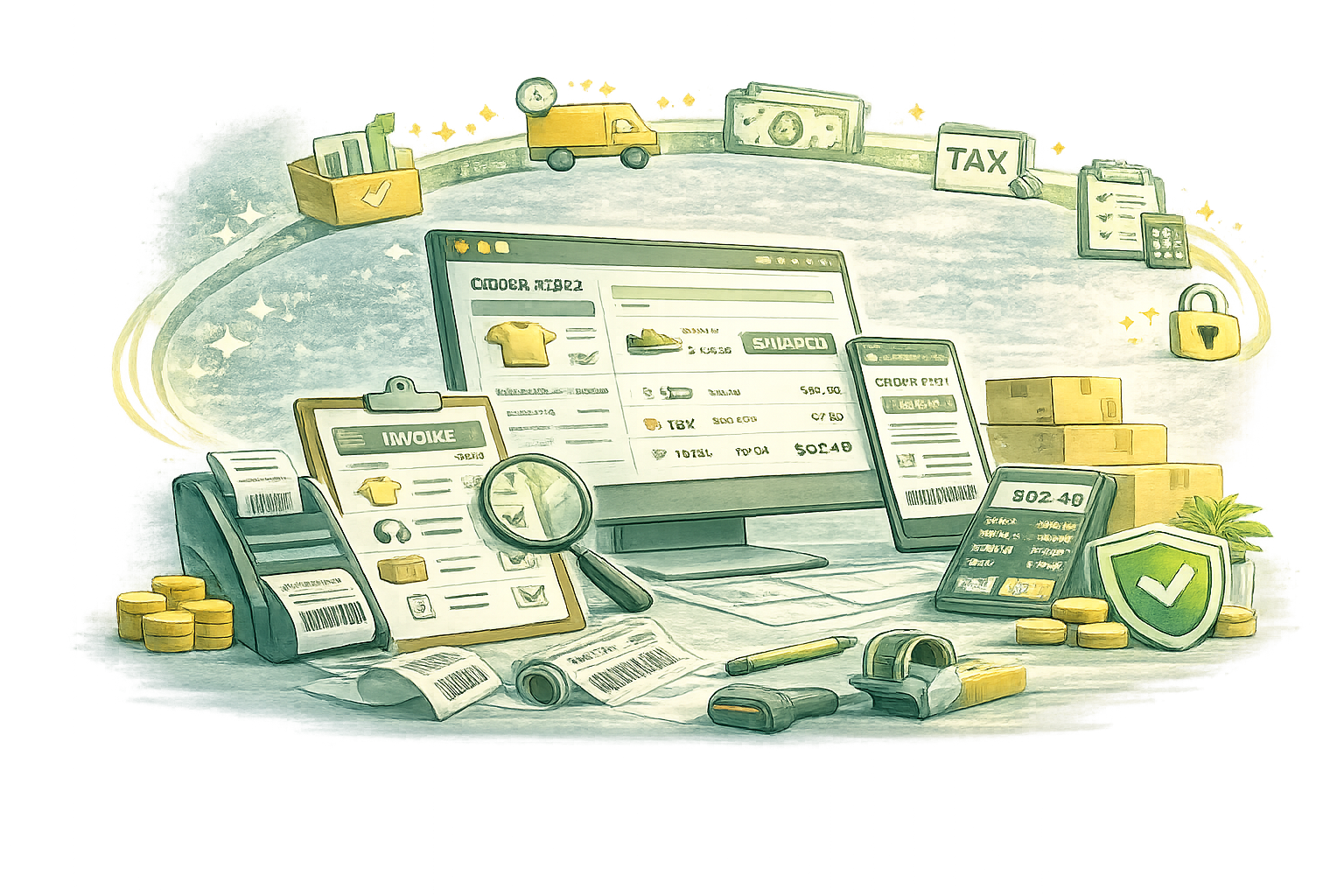 Complete order processing, shipping rules, and tax configuration.